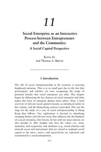 Au, K. and Birtch, Thomas T. A. (2010). Social enterprise as an interactive process between entrepreneurs and the community: A social capital perspective. In S.H. Ng, Stephen Y.-L. Cheung, and B. Prakash (eds.), Social Capital in Hong Kong—Connectivities and Social Enterprise: 279-301. Hong Kong: City University Press.